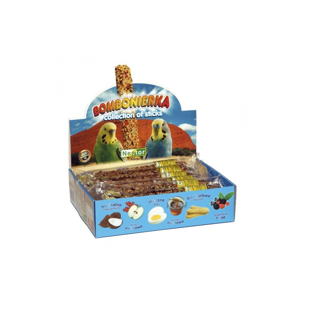 „Bombonierka“ yra lazdelių formos skanėstų rinkinys banguotosioms papūgėlėms ir kitiems mažiems, egzotiniams paukščiams, kurį sudaro skanėstai su biskvitais, kiaušiniu, medumi, miško uogomis ir tropiniais vaisiais. Šie skanėstai skirti paįvairinti ir praturtinti Jūsų augintinio mitybos racioną vitaminais, mineralais ir mikroelementais. Medinė kieta skanėsto šerdis pritaikyta taip, kad paukštis galėtų apsivalyti ir nusidilinti snapą. Skanėstai paukščiams yra ir kaip maisto papildas, ir kaip žaislas. Patogu pakabinti bet kokiame narve. Lazdelės formos skanėstai leidžia lesti sėklytes taip, kaip gamtoje.