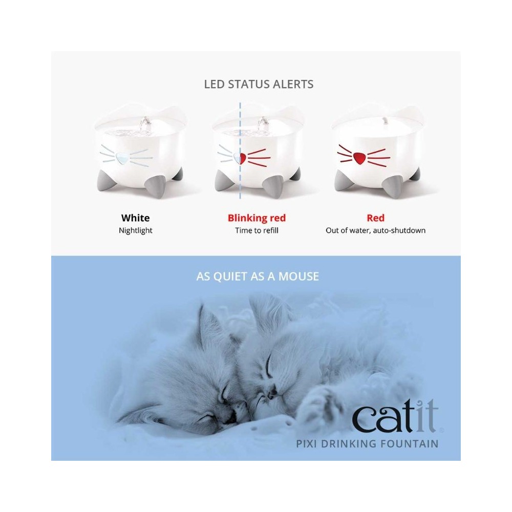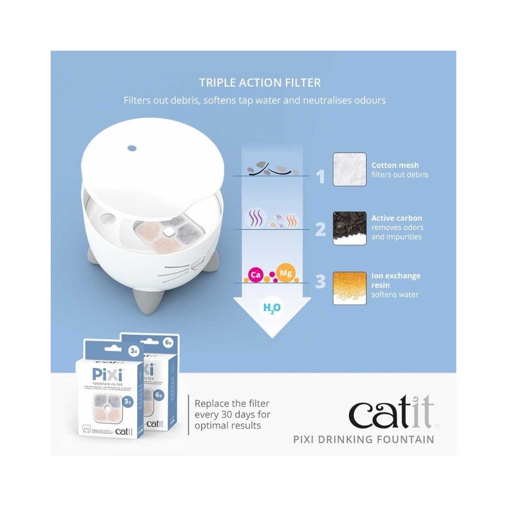 Geriamasis fontanas su trigubo veikimo filtravimu„Catit PIXI“ geriamajame fontanėlyje yra trigubo veikimo filtro pagalvėlė, kuri nuolat valo jūsų katės geriamąjį vandenį. Jis padeda pašalinti kvapus bei nešvarumus ir netgi suminkština vandenį, sumažindamas magnio ir kalcio kiekį. Dideliais kiekiais šie mineralai gali kauptis jūsų augintinio šlapimo takuose ir sukelti šlapimo takų ligas, kurios yra dažna kačių sveikatos problema.