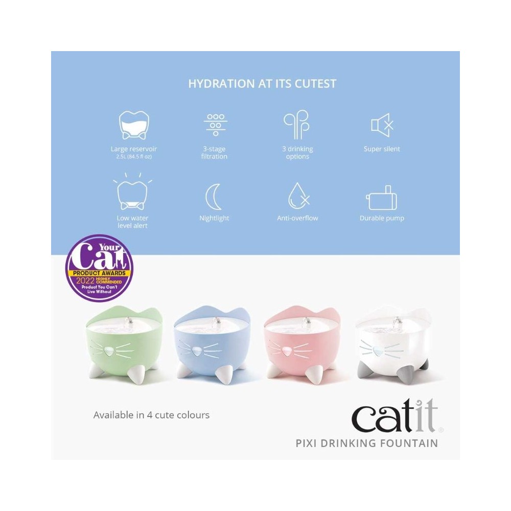 Geriamasis fontanas su trigubo veikimo filtravimu„Catit PIXI“ geriamajame fontanėlyje yra trigubo veikimo filtro pagalvėlė, kuri nuolat valo jūsų katės geriamąjį vandenį. Jis padeda pašalinti kvapus bei nešvarumus ir netgi suminkština vandenį, sumažindamas magnio ir kalcio kiekį. Dideliais kiekiais šie mineralai gali kauptis jūsų augintinio šlapimo takuose ir sukelti šlapimo takų ligas, kurios yra dažna kačių sveikatos problema.