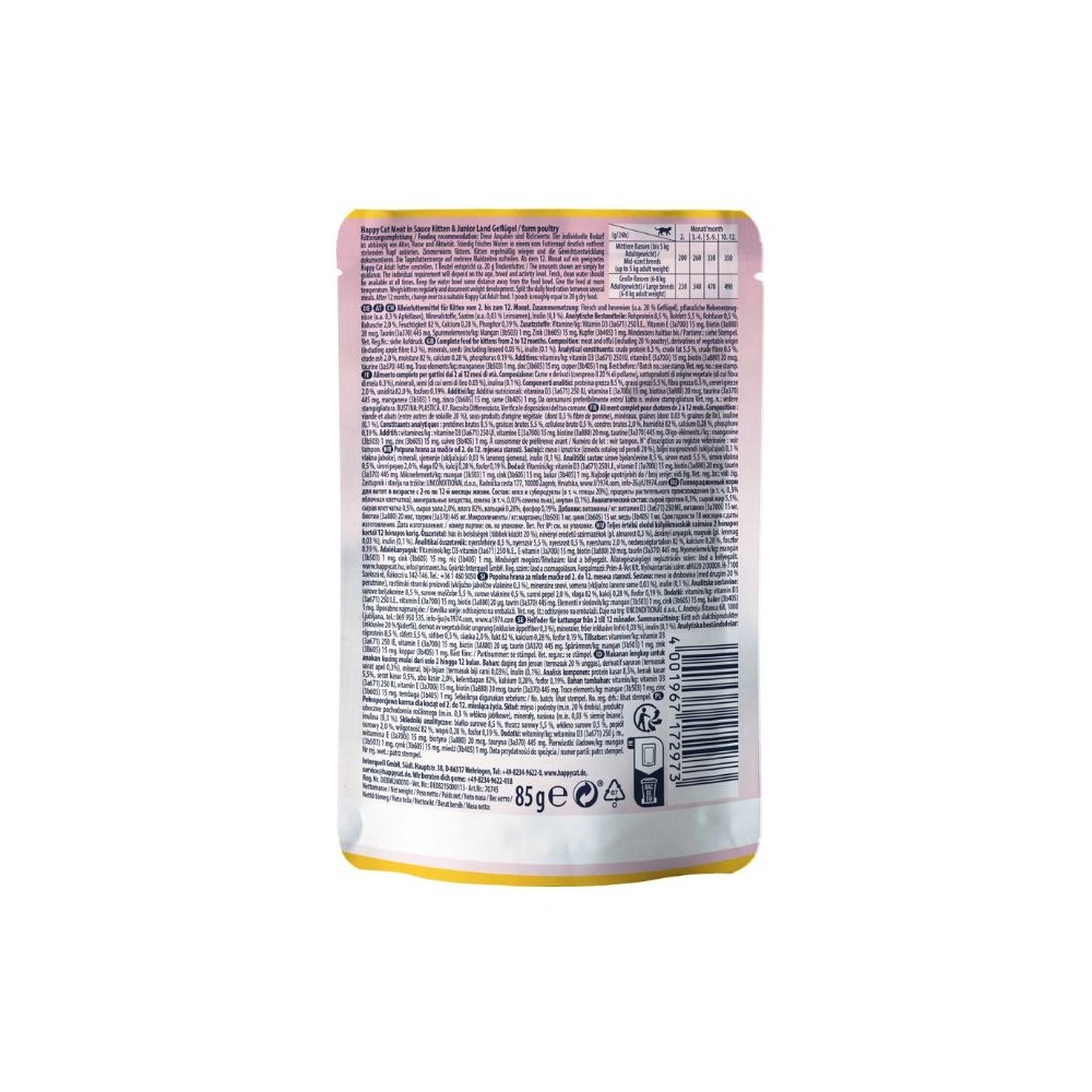 „Happy Cat Meat in Sauce Kitten & Junior“ sudėtyje – aukštos kokybės mėsa. Lengvai virškinamas guliašas su paukštiena ir skaniu padažu yra specialiai pritaikytas mažų kačiukų poreikiams. Skaniame pilnaverčiame maiste yra viskas, ko reikia harmoningam kačiuko augimui.