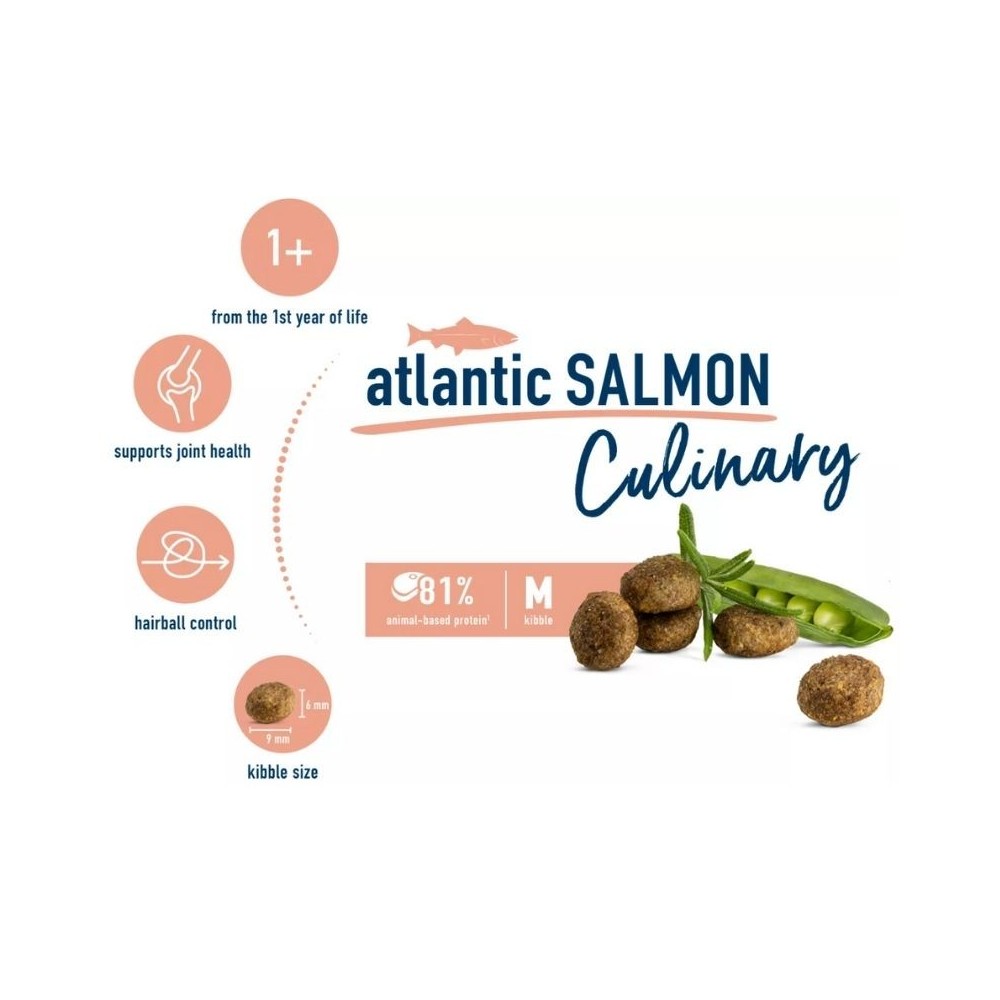 Sudėtis: paukštienos baltymai, lašišų miltai 12%, kukurūzų miltai, ryžių miltai, kukurūzai, gyvūninės kilmės riebalai (įskaitant paukštienos), bulvių dribsniai, mėsos miltai, ryžių baltymai, saulėgrąžų aliejus 2,4%, lignoceliuliozė 2,0%, hidrolizuota žuvis, rcukrinių runkelių minkštimas (pašalintas cukrus), rapsų aliejus 0,6%, kiaušinių milteliai, kalio chloridas, mielės, obuolių minkštimas 0,4%, natrio chloridas, morkos 0,25%, jūrų dumbliai, linų sėmenys 0,16%, cikorijų milteliai (0,15%=0,1% inulino), Yucca shidigera 0,1%, žirnių dribsniai 0,13%, burokų miltai 0,13%, moliuskų mėsa 0,05%, mielės (ekstraktas, 0,02%=0,0032% MOS), kiaulpienės, artišokai, ramunėlės, imbieras, beržų lapai, dilgėlės, mielių ekstraktas, tikrieji margainiai, kalendros, rozmarinai, šalavijai, saldymedžių šaknys, čiobreliai. Iš viso džiovintų žolelių 0,13%.
