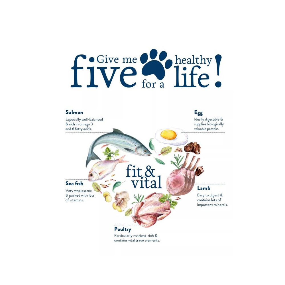 Sudėtis: gyvūninės kilmės baltymai (paukštienos 16%, ėrienos 4%), kukurūzų miltai, kukurūzai, aliejai ir riebalai, miežiai, spirgučiai, žuvų miltai (5%, iš kurių 50% lašišos miltų), ryžiai, hidrolizuoti baltymai, cukrinių runkelių išspaudos (pašalintas cukrus), obuolių išspaudos, kalio chloridas, natrio chloridas, linų sėmenys 6%, kiaušinių milteliai 0,1%, tikrieji margainiai, mielės (ekstraktas), midijų mėsa 0,02%, Yucca schidigera, artišokai, kiaulpienės, imbierai 0,016%, beržų lapai, dilgėlės, ramunėlės, kalendros, rozmarinai, šalavijai, saldymedžių šaknys, džiovinti čiobreliai (iš viso džiovintų žolelių 0,15%).