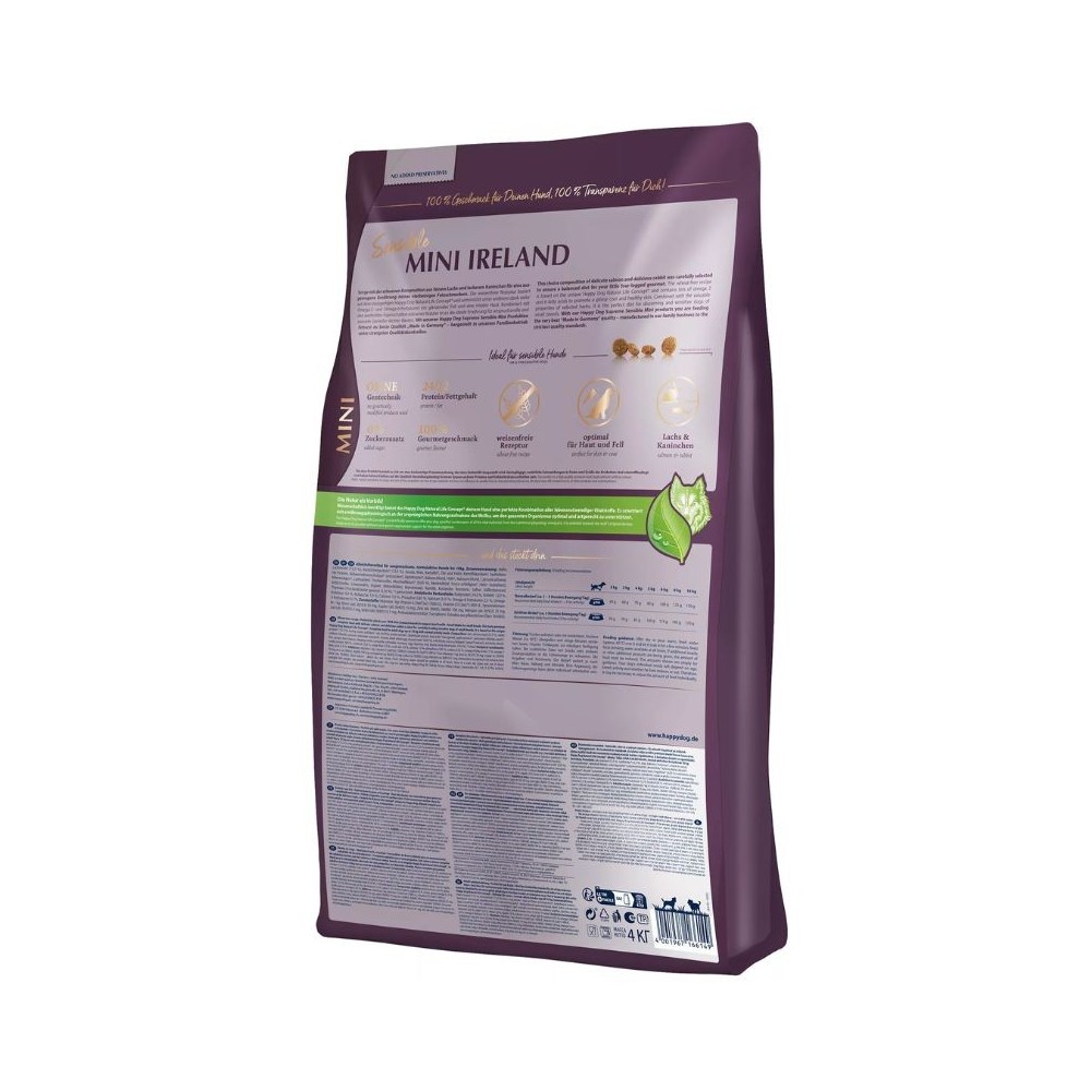 Happy Dog Mini Ireland subalansuotas visavertis maistas suaugusiems mažų veislių, vidutinio aktyvumo  šunims. Itin skanaus ir ypač gerai toleruojamo super premium klasės „Happy Dog Mini Ireland“ visaverčio maisto sudėtyje  yra triušienos ir lašišos. Specialiai pritaikytos granulės idealiai tinka visiems mažų veislių šunims. Maistas puikiai tiks šunims turintiems jautrią virškinimo sistemą ir tiems, kurie maistui išrankūs.Maistas pagamintas iš kruopščiai atrinktų ingredientų, gamybos procesas yra nuolatos stebimas, o baltymų ir energinės vertės kiekis derinamas su šuns poreikiais.