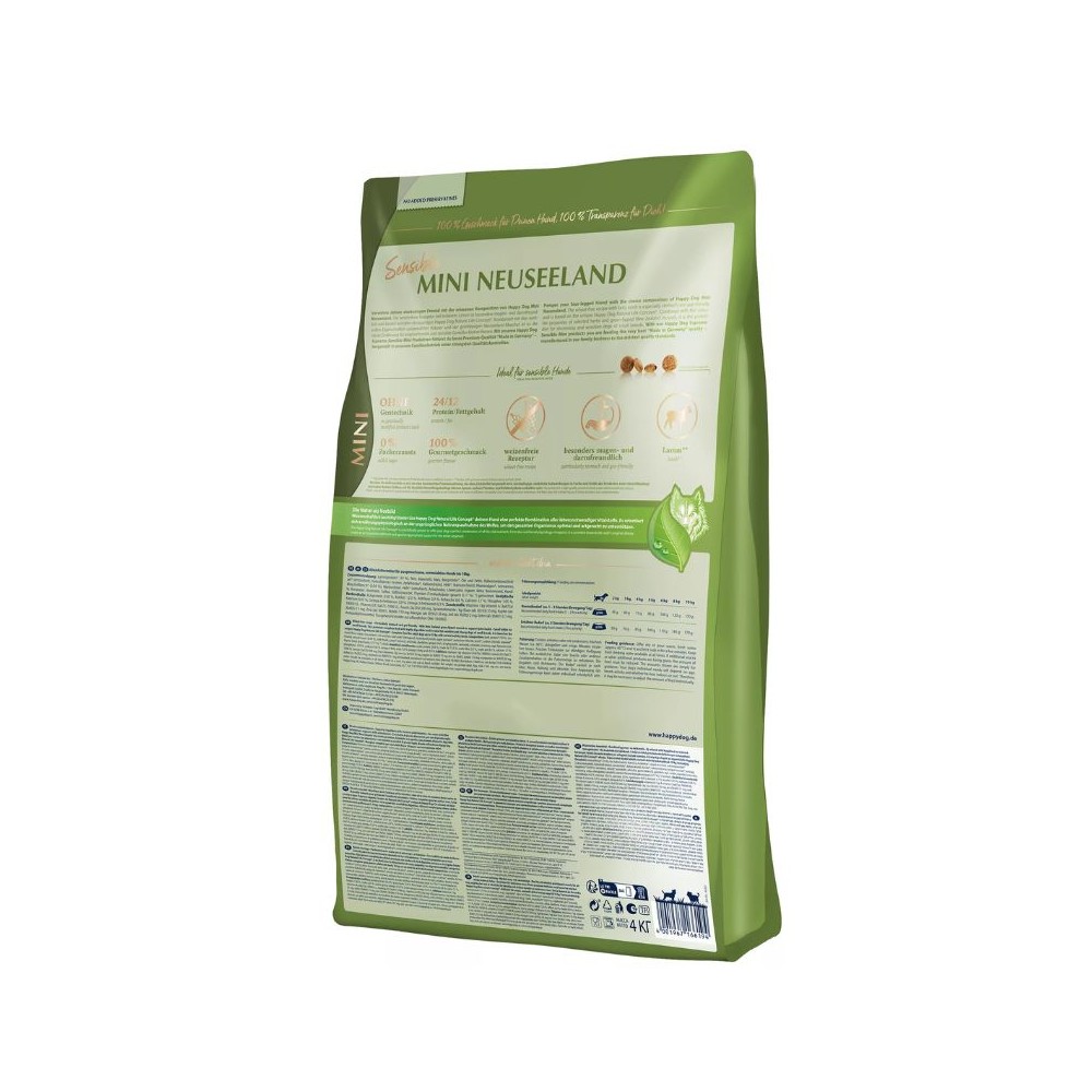 Happy Dog Mini Neuseeland subalansuotas visavertis maistas suaugusiems mažų veislių, vidutinio aktyvumo šunims. Itin skanaus ir ypač gerai toleruojamo super premium klasės „Happy Dog Mini New Zealand“ visaverčio maisto sudėtyje yra ėrienos baltymų ir maistingų Naujosios Zelandijos žaliųjų midijų mėsos. Specialiai pritaikytos granulės idealiai tinka visiems mažų veislių šunims. Maistas puikiai tiks šunims turintiems jautrią virškinimo sistemą ir tiems, kurie maistui išrankūs.,,Mini New Zealand” maistas pagamintas iš kruopščiai atrinktų ingredientų, gamybos procesas yra nuolatos stebimas, o baltymų ir energinės vertės kiekis derinamas su šuns poreikiais.