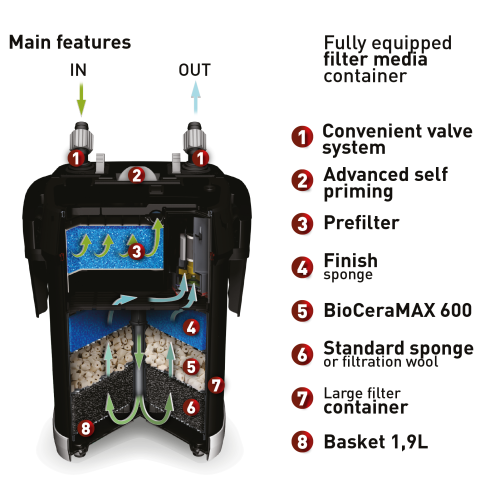 Didelė talpa filtracinėms medžiagoms. ULTRAMAX išorinis akvariumo filtras – itin galingas, jame telpa daug filtracinių medžiagų. Vienoje kasetėje-krepšelyje telpa apie 1,9 l. Taip užtikrinamas itin efektyvus mechaninis ir biologinis filtravimas. Pirminėje komplektacijoje pateikimi visi tipiniam akvariumui reikalingi užpildai: viršutiniame sluoksnyje smulki kempinė, viduriniame „BioCera Max 600“, apatiniame – filtravimo vilna.