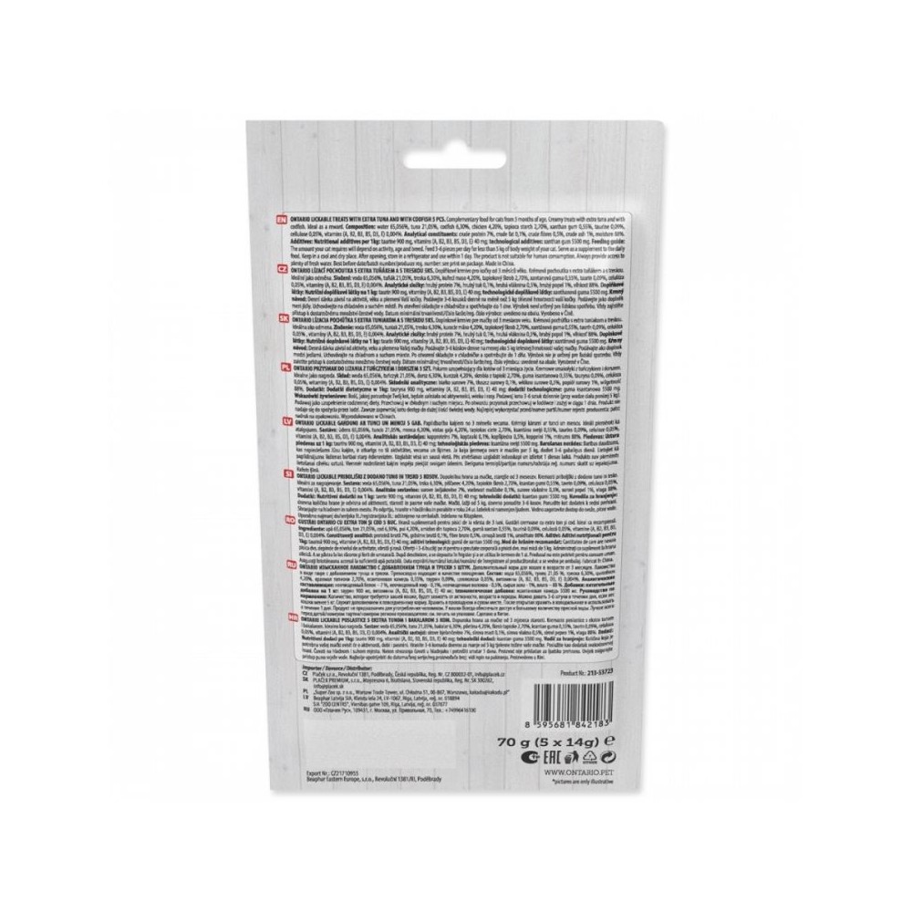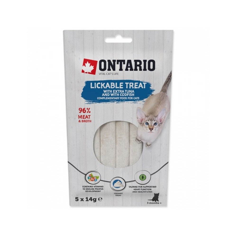 Ontario laižomi skanėstai supakuoti patogioje penkių 14 g tūbelių pakuotėje, kad pasta būtų šviežia ir paruošta patiekti. Katę galite šerti tiesiai iš tūbelės, ant laižymo kilimėlio, kitų interaktyvių žaislų arba naudoti sauso maisto skoniui pagerinti, jei katė jo atsisako.