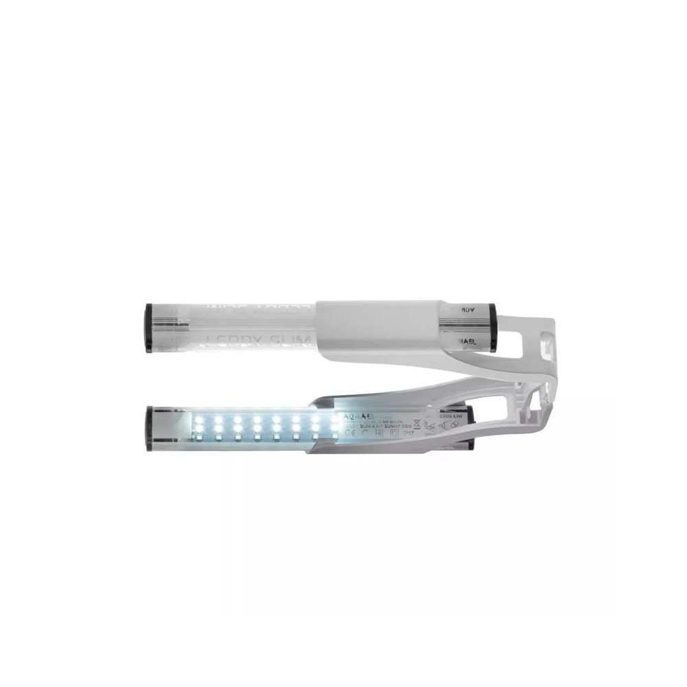 LEDDY SLIM SUNNY DAY&NIGHT LED lempa skirta apšviesti gėlo vandens atvirus akvariumus. Jame yra kruopščiai atrinkti šviesos diodai, kurie puikiai apšviečia akvariumą, garantuoja puikias gyvenimo sąlygas jo gyventojams ir unikalų vizualinį efektą. Dėl plokščios, futuristinės formos ir madingos juodos arba baltos spalvos jis puikiai dera prie šiuolaikinių akvariumų ir puikiai atrodo bet kokiame interjere. Be to, jis yra universalus – ištraukiami laikikliai leidžia montuoti ir ant nestandartinių dydžių akvariumų.