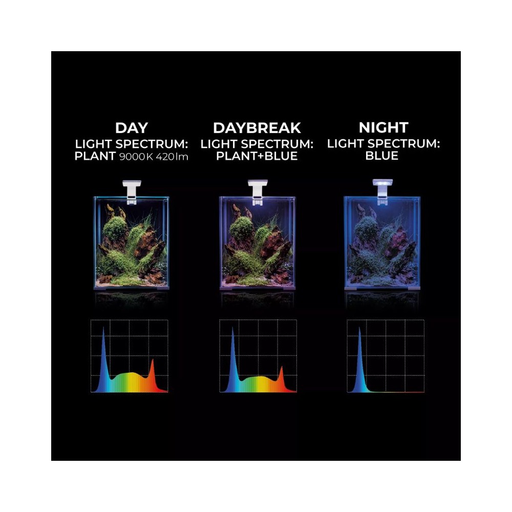Šviestuvas praturtintas Day & Night funkcija, kurios dėka, priklausomai nuo jūsų poreikių, galite pasirinkti vieną iš trijų apšvietimo režimų DAY / DAYBREAK / NIGHT. Tai yra du skirtingi dienos šviesos ir mėlynos nakties šviesos lygiai. DAY yra pagrindinė ir stipriausia šviesa, skirta apšviesti akvariumą dienos metu. DAYBREAK yra sumažinta dienos apšvietimo galia iki 50 % plius mėlyna šviesa. Puikiai veikia kaip pirmasis režimas po nakties ir šeriant žuvis – ypač nedrąsias. NIGHT yra mėlyna šviesa, leidžianti unikaliai stebėti akvariumą sutemus, įskaitant naktines žuvis ir gyvūnus. Dienos ir nakties apšvietimas gražiai parodys akvariumo išdėstymą tiek dieną, tiek naktį, taip pat padarys jaukesnį kambario, kuriame yra akvariumas, interjerą.