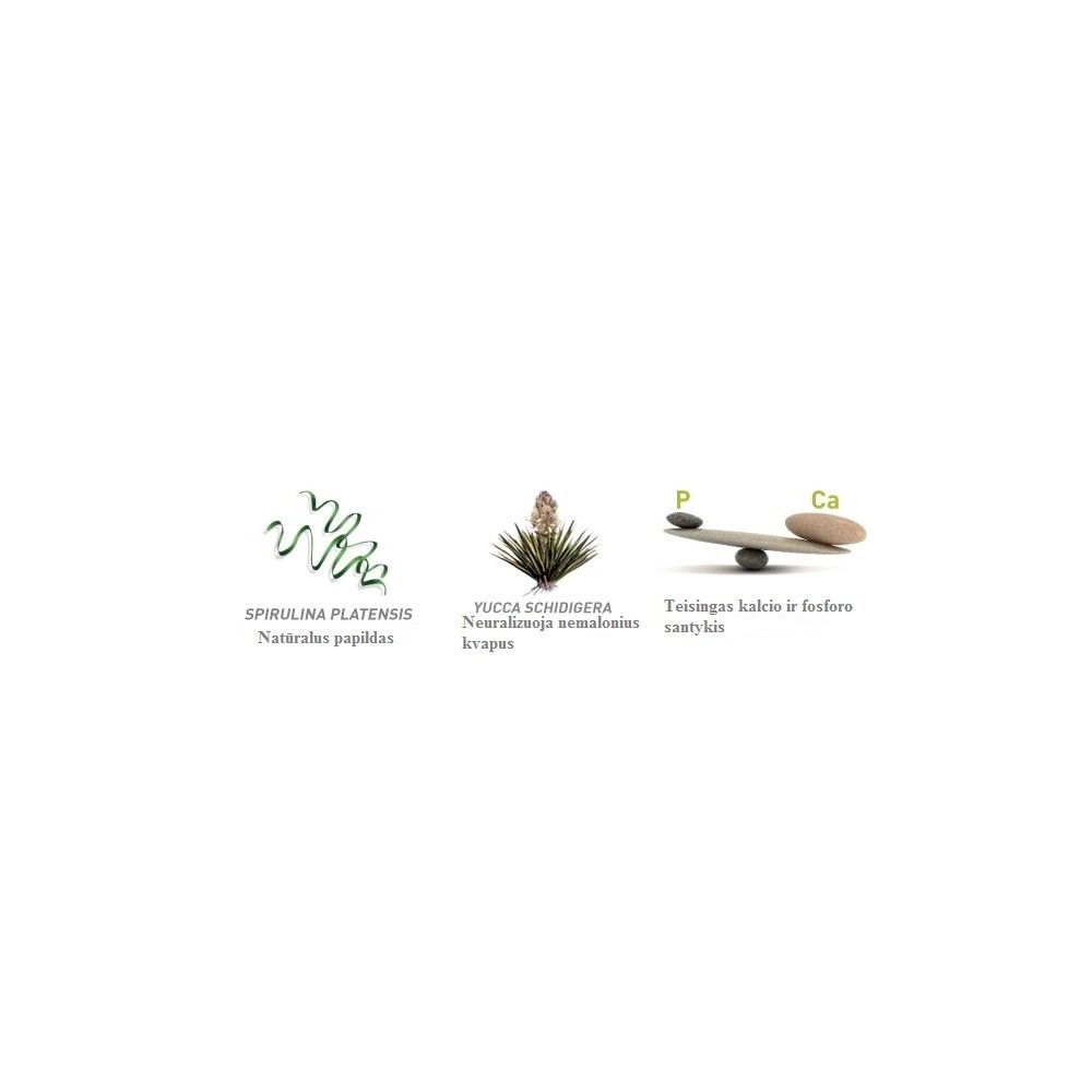 Sudėtis: augaliniai produktai, grūdai, dumbliai (spirulina 3%), sėklos, mineralai, juka (0,015%).
