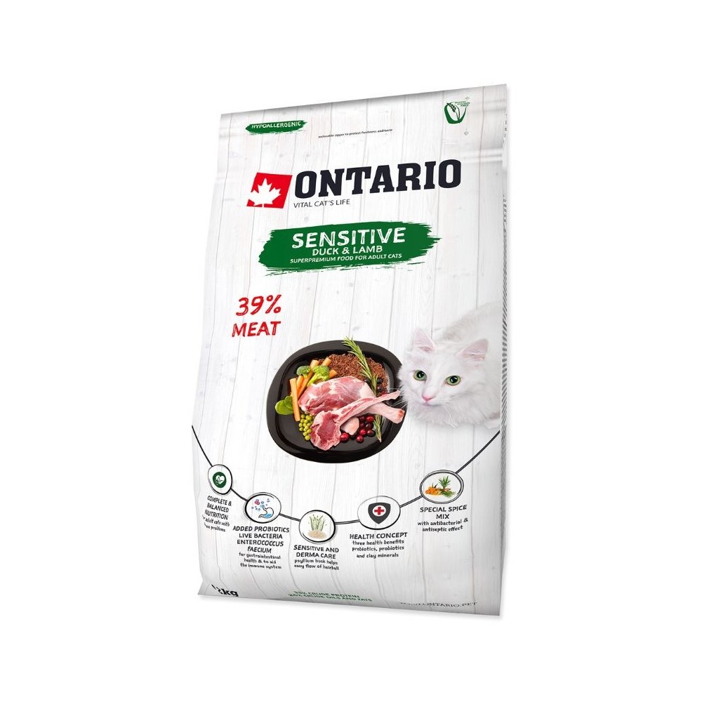 Ontario Cat Sensitive sudėtyje yra vaisių, daržovių ir žolelių, aprūpinančių gyvūno organizmą vitaminais ir mikroelementais, užtikrinant katės sveikatą ir gerovę bei gerinančių jos virškinimo sistemos veiklą. Šio kačių maisto sudėtyje yra: linų sėmenų, džiovintų obuolių, džiovintų morkų, mineralų, džiovintų trūkažolių, džiovintų spanguolių, džiovintų mėlynių, džiovintų špinatų, džiovintų brokolių, rozmarinų, vynuogių, ciberžolės, citrusinių vaisių, Yucca schidigera.