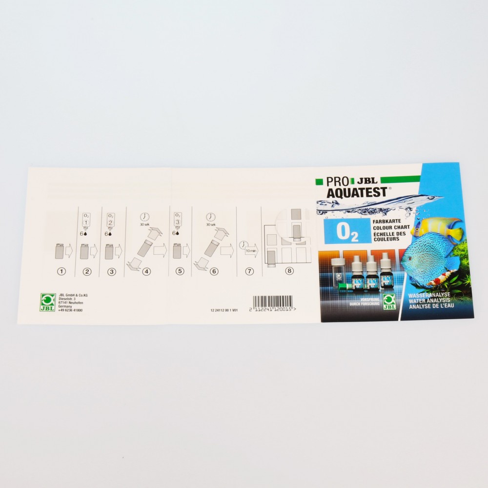 Naudojimas:1. Praskalaukite mėgintuvėlį tiriamuoju vandeniu. 2. Mėgintuvėlį užpildykite tiriamuoju vandeniu (semkite tiesiai iš akvariumo). 3. Įlašinkite 6 lašus reagento Nr. 1 ir 6 lašus reagento Nr. 2., lėtai vieną po kito, kol mėgintuvėlis persipildys. 4. Mėgintuvėlyje neturėtų būti oro burbuliukų. Užkimškite mėgintuvėlį kamšteliu ir stipriai purtykite apie 30 sekundžių. 5. Nuimkite kamštelį nuo mėgintuvėlio ir įlašinkite 6 lašus reganeto Nr. 3.6. Vėl užkimškite mėgintuvėlį kamšteliu, oro burbuliukai šiame etape yra nesvarbūs. Stipriai purtykite apie 30 sekundžių ir tada palikite 10 minučių, kol išryškės spalva. 7. Mėgintuvėlį pasistatykite ant spalvų skalės baltų langelių. Stumdami mėgintuvėlį, vizualiai įvertinkite spalvų panašumus ir pasirinkite labiausiai tinkamą. 8. Tai ir bus tiriamo vandens deguonies kiekis.