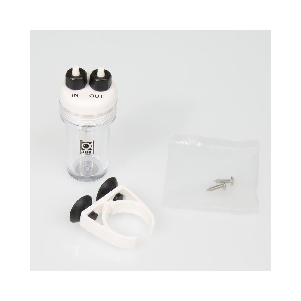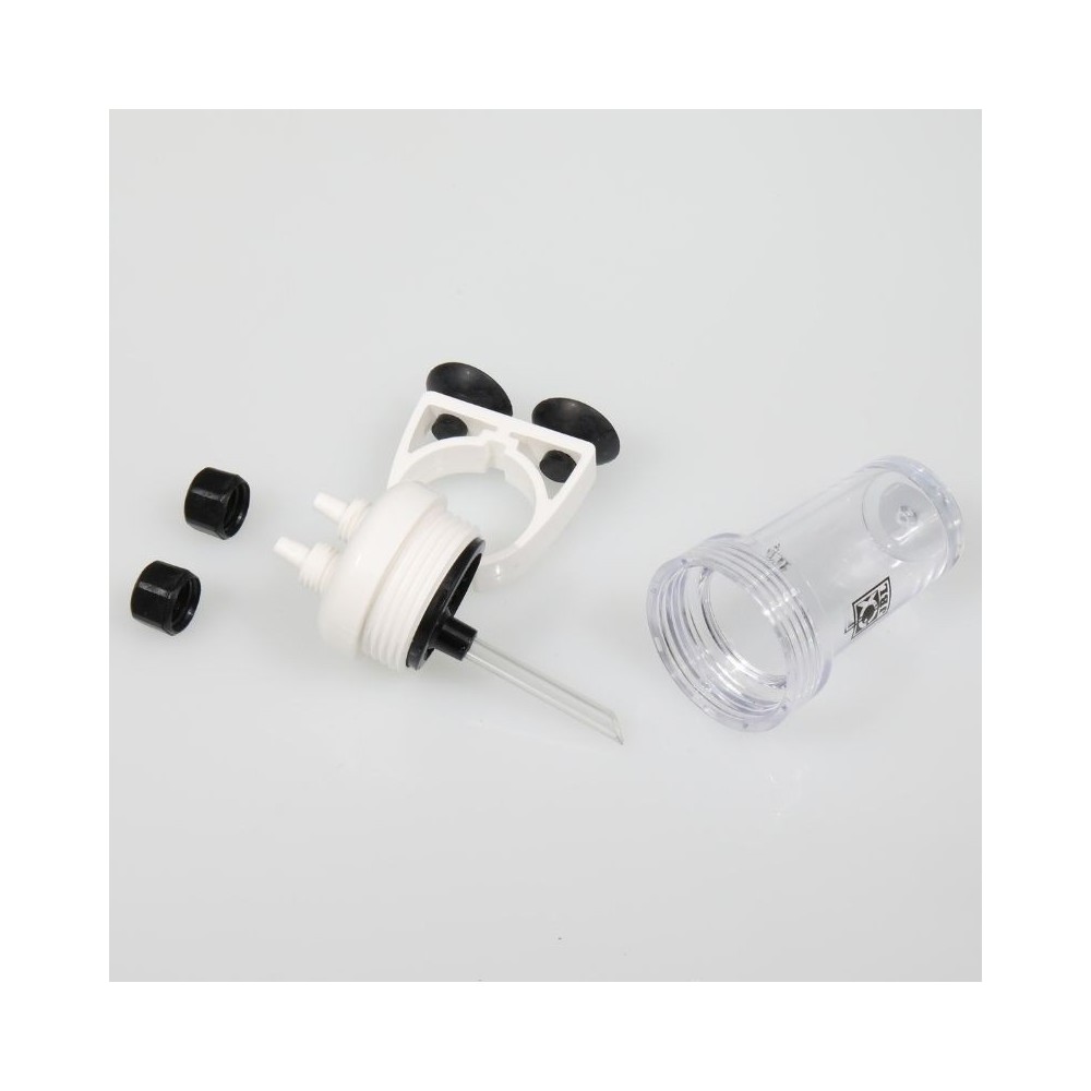Pakuotės turinys: CO2 burbulų skaitiklis su įmontuotu atbuliniu vožtuvu; laikiklis su 2 siurbtukais/varžtais;