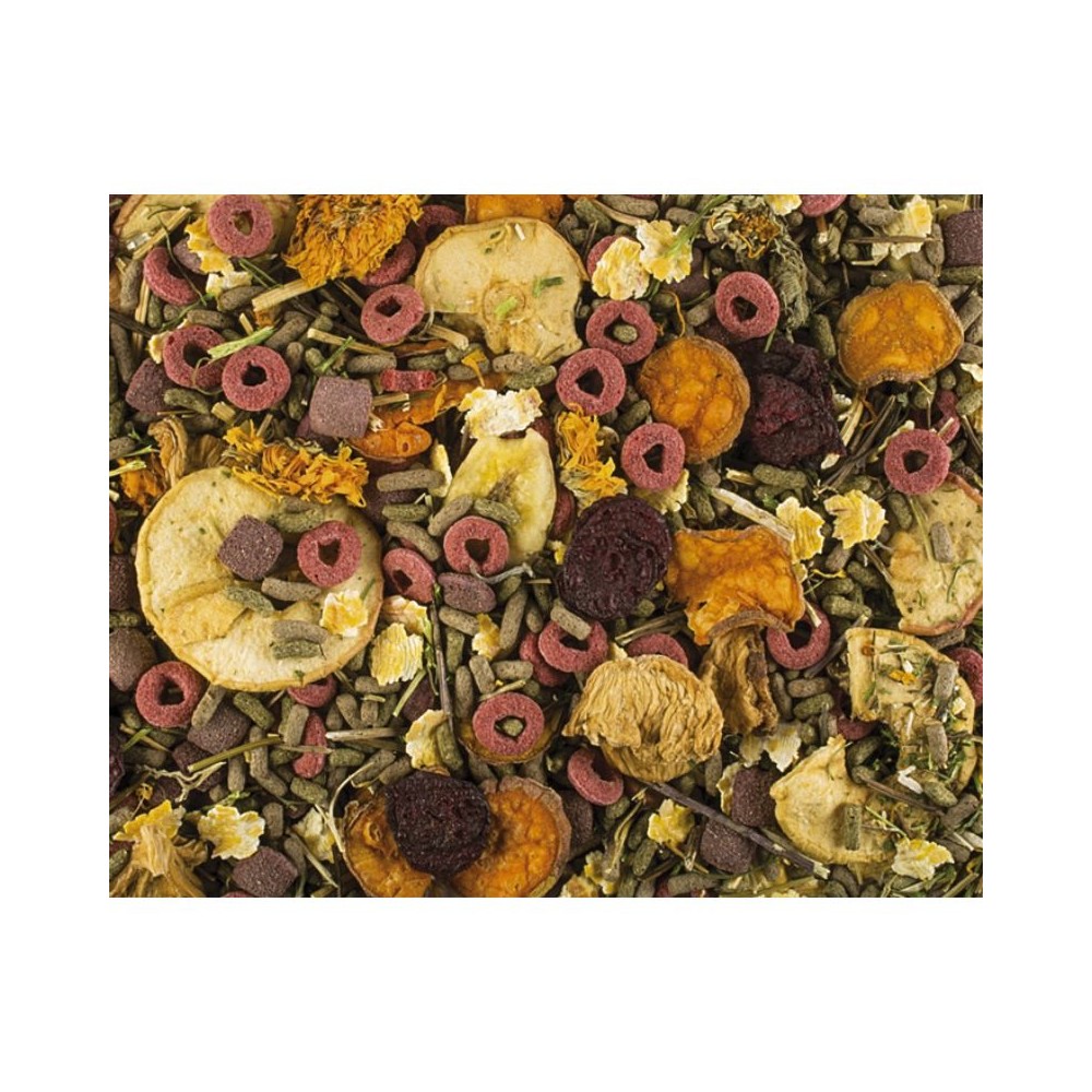 Sudėtis: grūdai (įskaitant kukurūzus), vaisiai (džiovinti obuoliai granulėmis 15%, džiovinti obuoliai 2%, džiovinti ananasai. džiovinti bananai), augaliniai produktai (alfalfa granulės 5%, mėtos, ramunėlės, petražolės, medetkų žiedai), daržovės (džiovinti burokėliai 2%, džiovintos morkos 2%), sėklos (linų sėmenys granulėmis 1,5%), mineralai (zeolitas 1%).