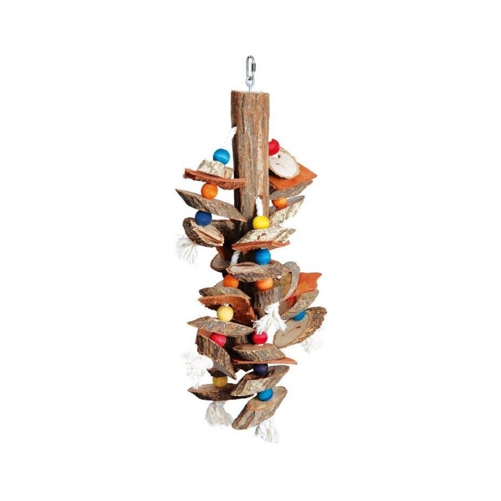 Natūralios medžiagos: Žaislas pagamintas iš saugių ir patvarių medžiagų, tokių kaip medis ir oda, užtikrinant ilgaamžiškumą ir saugumą jūsų paukščiui.
