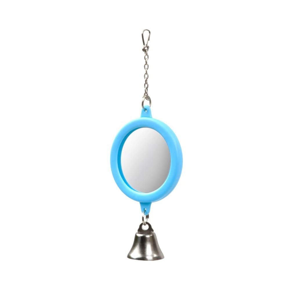 Plastmasinis apvalus veidrodėlis su varpeliu – žaislas egzotiniams paukščiams. Rekomenduojama, jei narvelyje gyvena vienas paukštis.